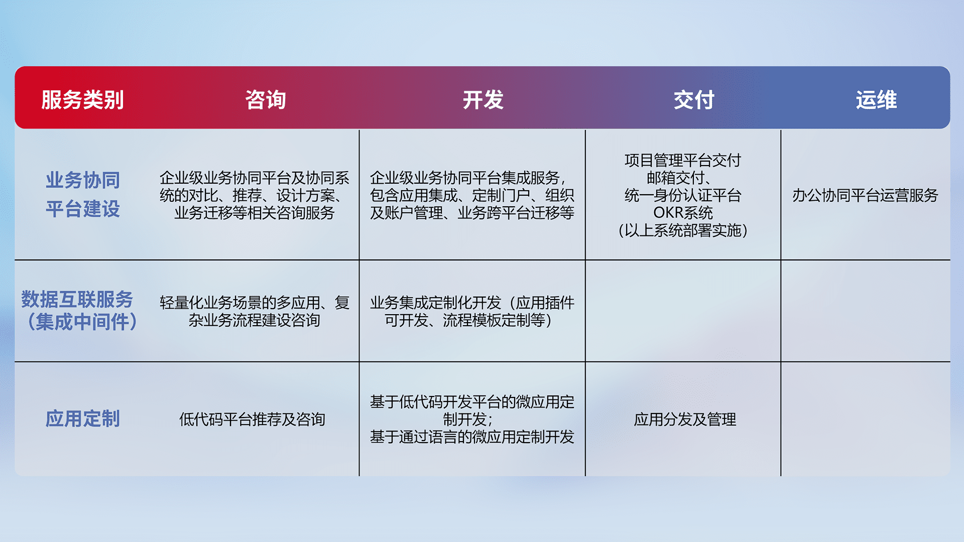 针对钉钉、、、企微、、、IDaas等平台级产品提供产品的规划、、、方案、、交付、、、、定制化开发等服务,,实现如统一协同办公、、、智能客户服务、、、、混合会议管理、、智能数据查询、、、等业务场景,,,实现数字化转型。。。